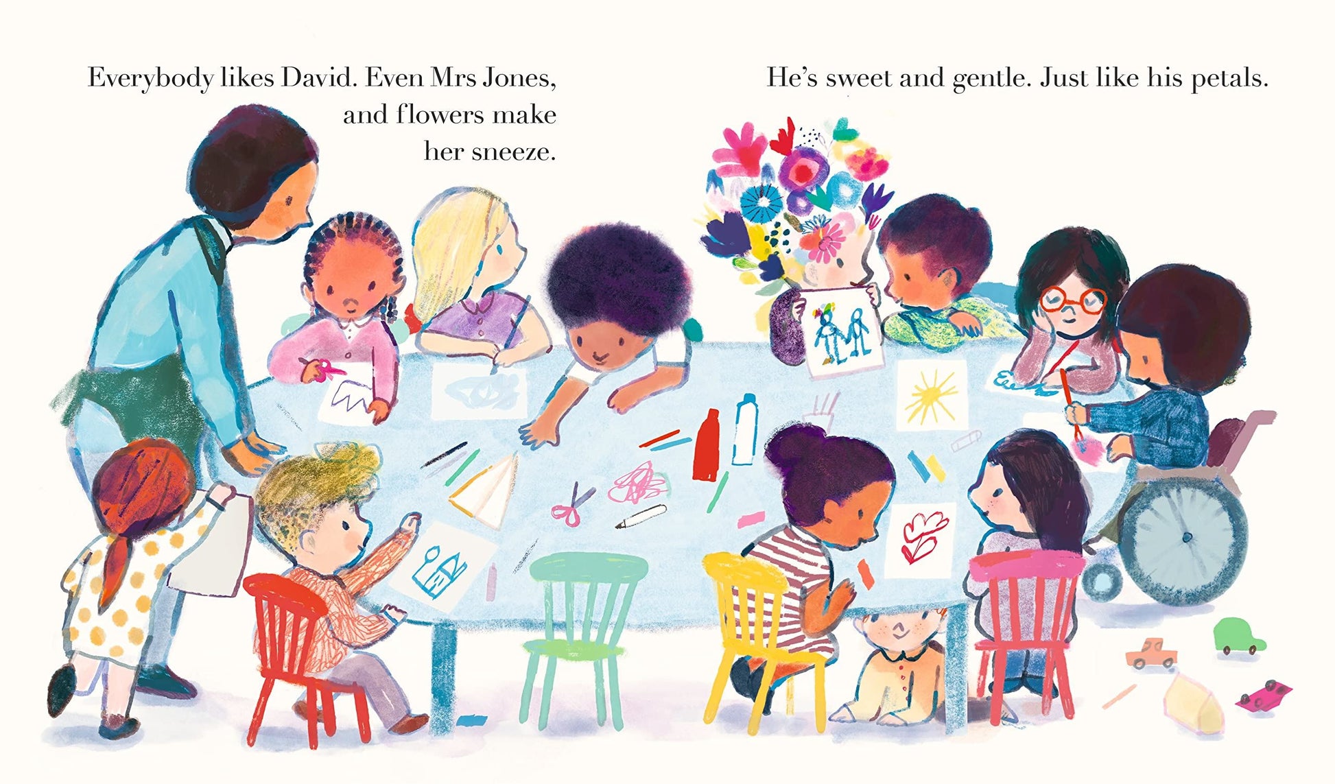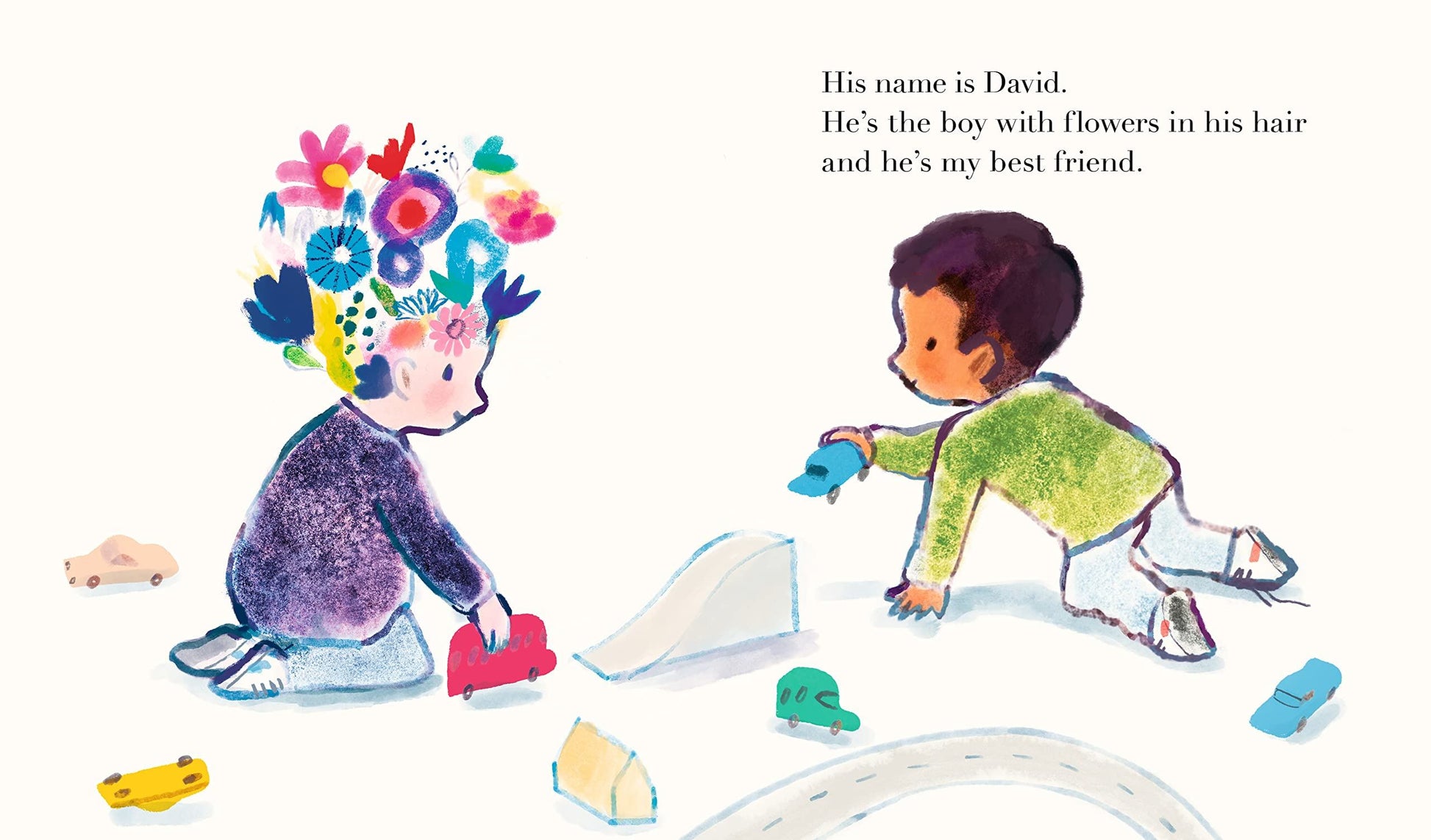 David is the boy with flowers in his hair. He’s sweet and gentle, just like his petals. But when David’s flowers begin to fall – a single petal at first, then every last blossom – his best friend never leaves his side. And through kindness and creativity, he even finds a way to give David his colour back.