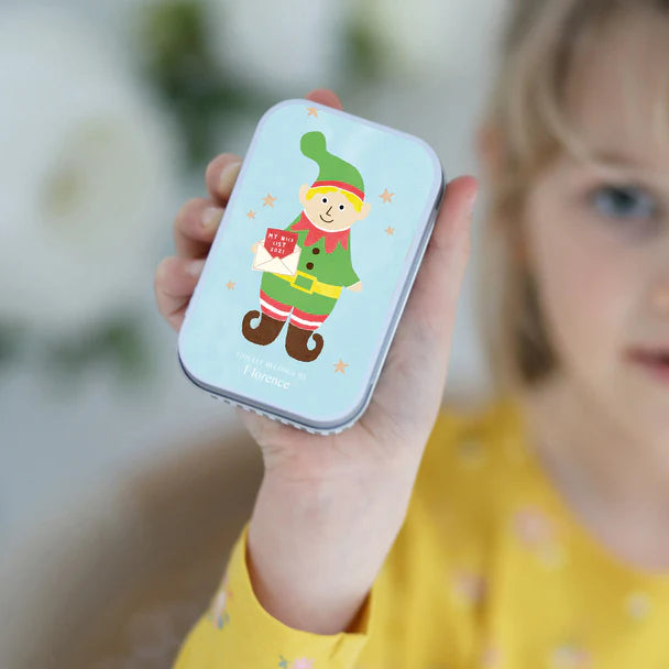 The tins can be personalised with the child's name on the front, & there are instructions on the reverse to feed the elf, tuck it in with its little teddy, & there's also a suggestion for great behaviour in the run up to Christmas.