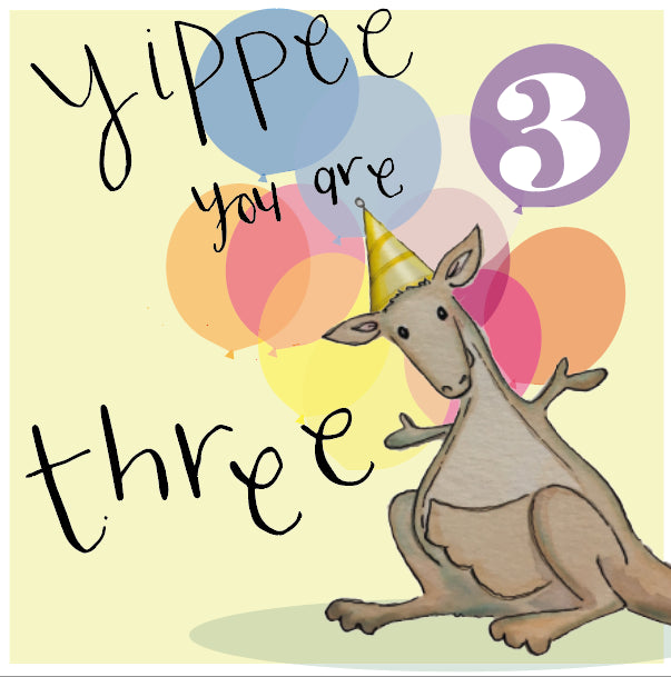 Yippee, you are Three! A party-ready kangaroo with a load of balloons! The background is multi coloured so that this card feels more gender neutral and is a good card to have on standby.
