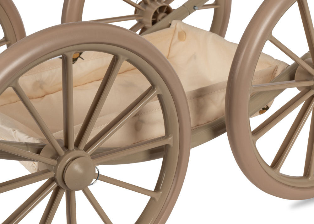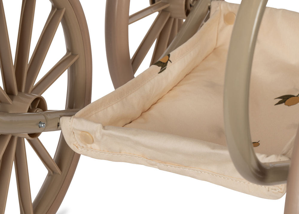 The doll pram includes a soft mattress and a cushioned storage basket under the lift. The frame is made of metal with spongy soft handles.