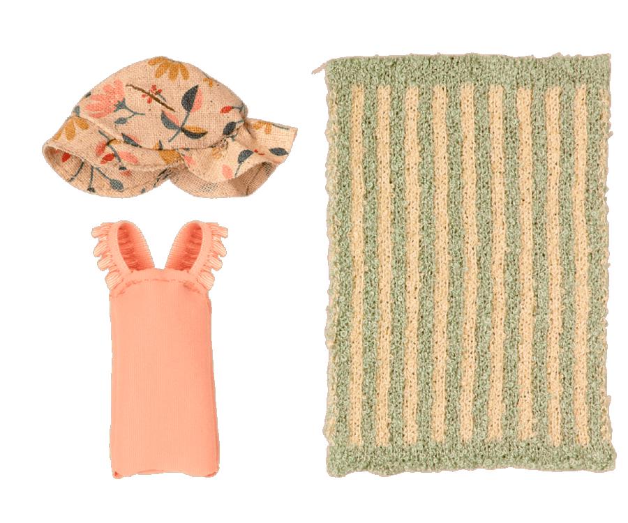 Vacation time. This set includes all essential accessories for a fun day at the beach: a bathing suit, sunhat, and a towel. It all fits the mice in size big brother/sister perfectly.