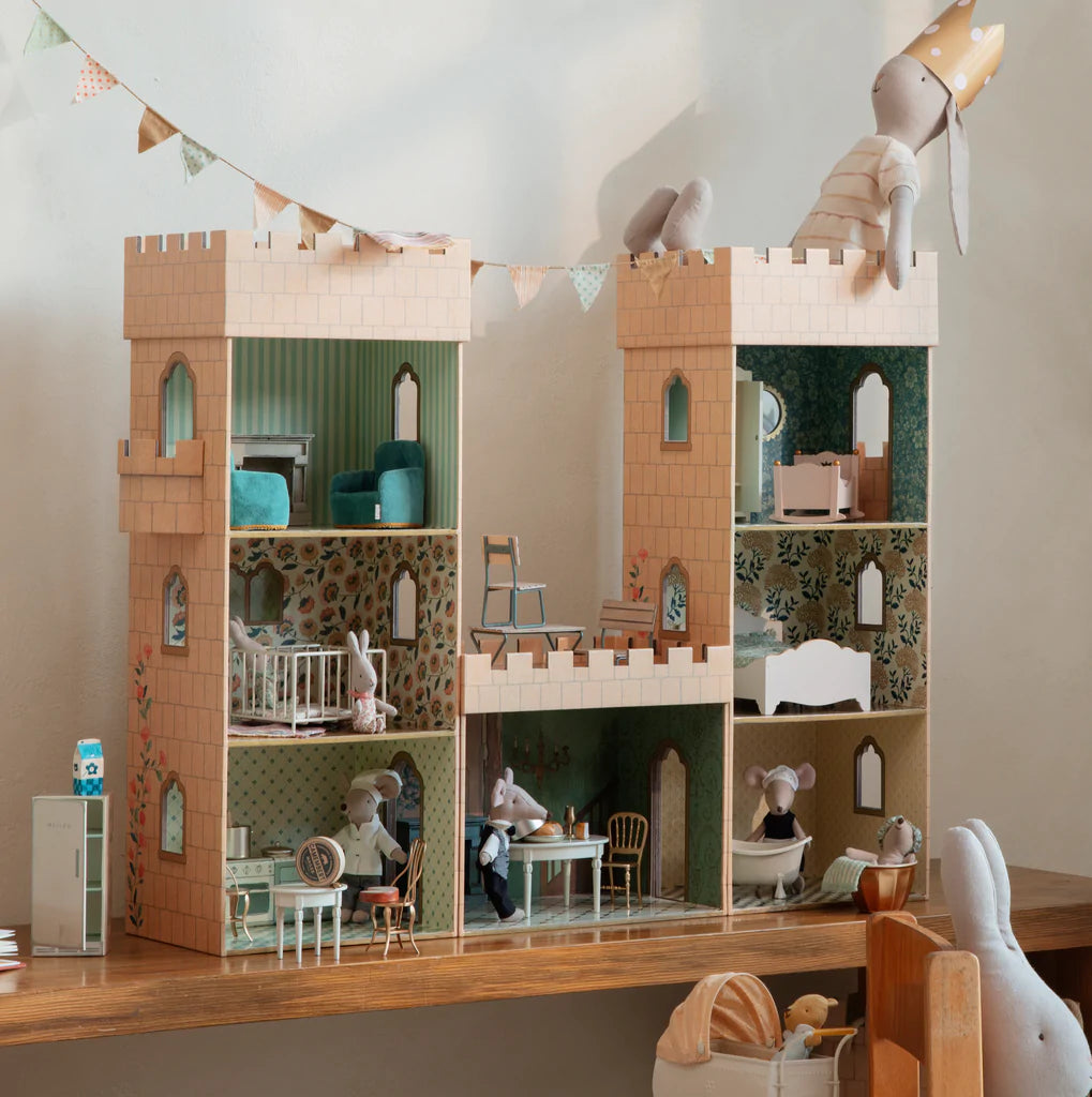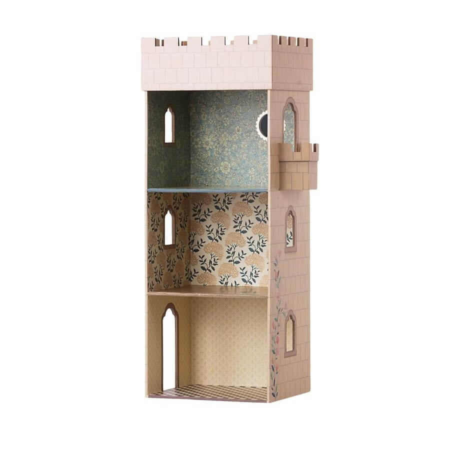 Castle w. Kitchen- This castle is a beautiful home for all mice. It is made of cardboard covered by unique Maileg prints. Mainfloor is a cosy kitchen and 2. floor has a nice balcony. Let the story begin. H62cm W24cm Material: Paper