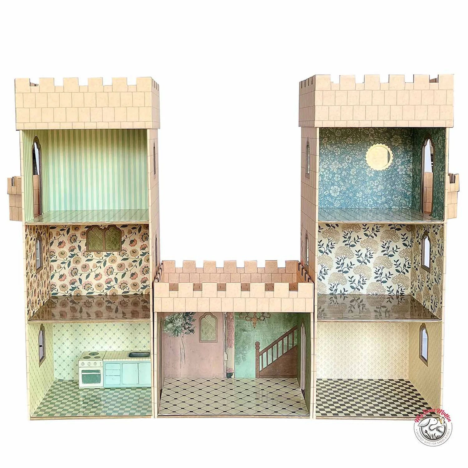 Castle w. Mirror -It is made from sturdy cardboard with three floors all beautifully decorated. On the 2nd floor there is a mirror and a turret balcony. It can also be joined to the castle with a kitchen using the castle hall as a connecting corridor, both of which are available to purchase. H62cm W24cm Material: Paper