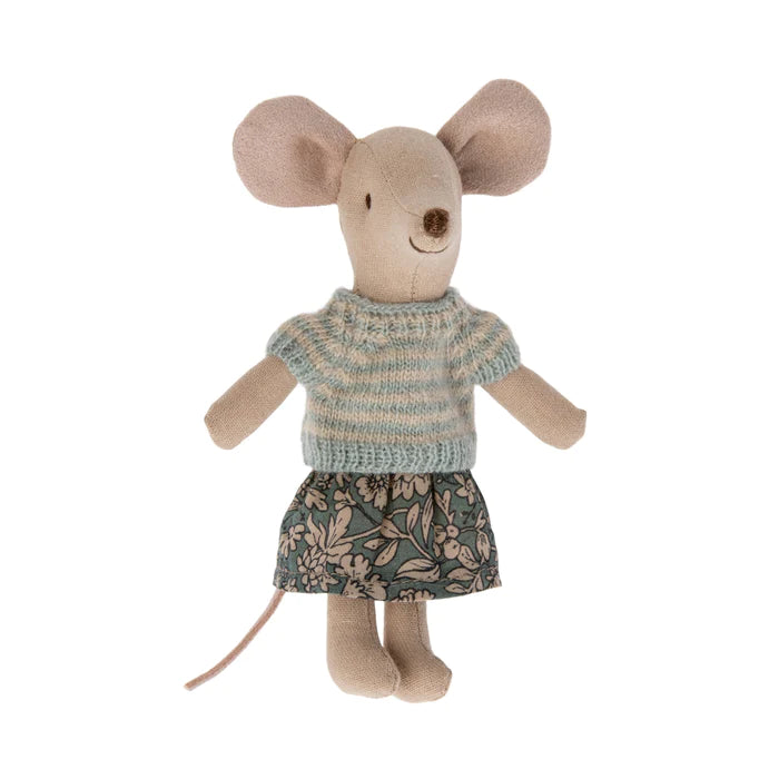 Maileg knitted Jumper and floral skirt for big sister mouse. This is a lovely set that is great fun for children, they enable them to change the look of their mice. This set includes of a soft Angora jumper and linen trousers. All big brother mice will want this outfit.