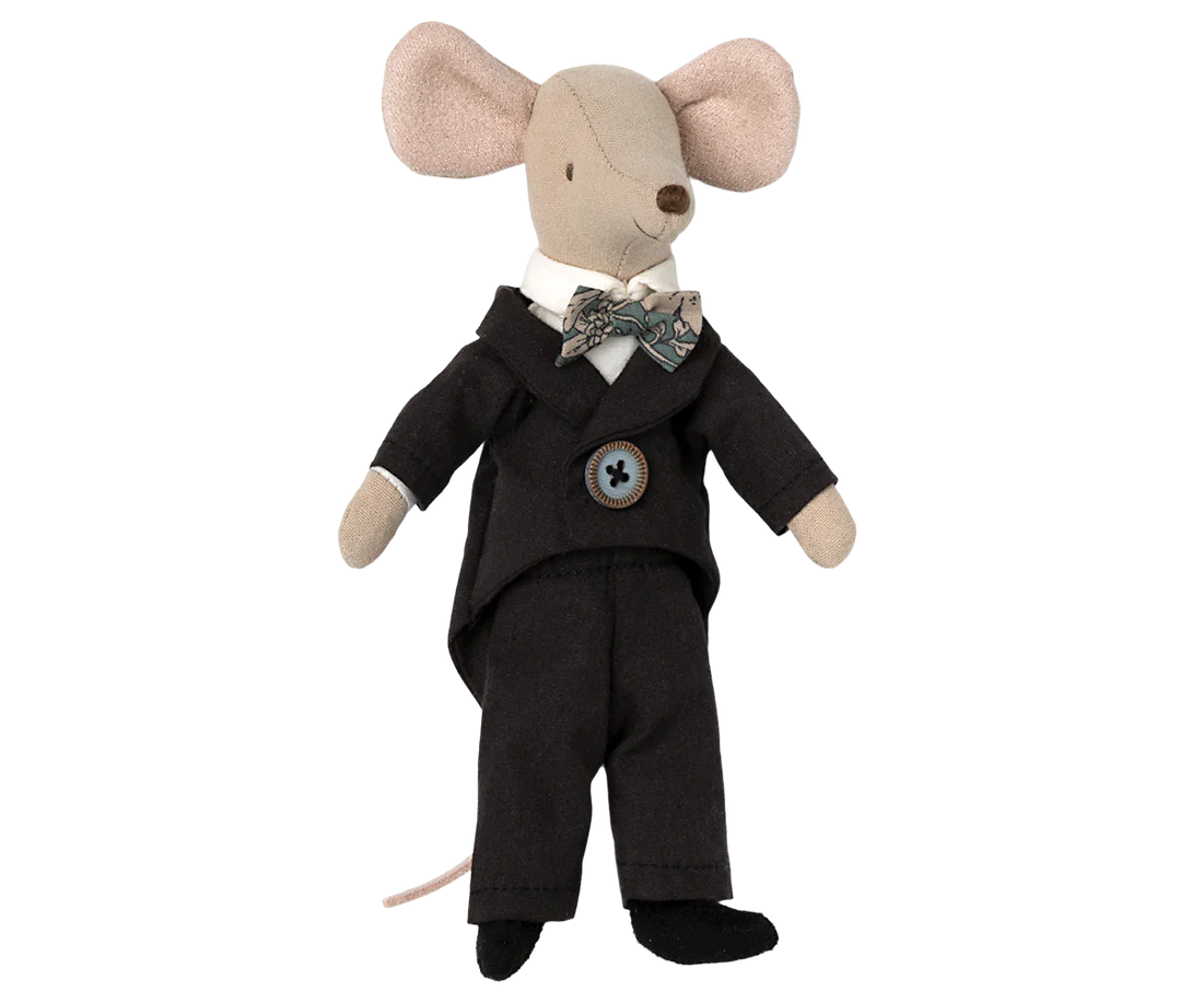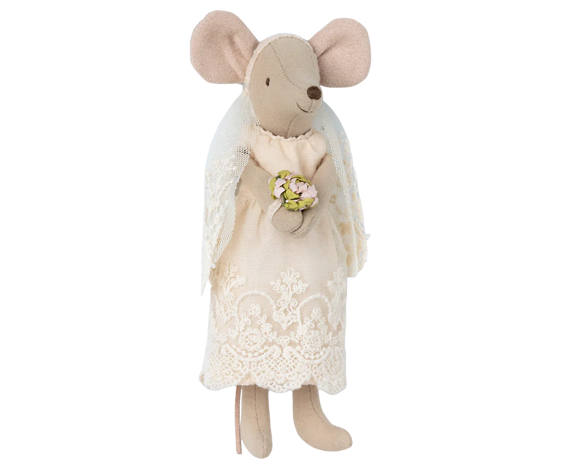 A beautiful love story which starts on the wedding day of these two mice. They are dressed classically in a long white dress, lace veil, bouquet and tuxedo. They come in a beautiful box decorated with Maileg drawings.