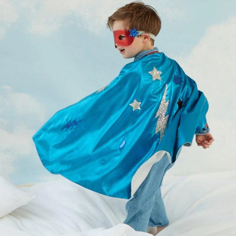 The cape, crafted from lined blue lame, has glittery decorations glued and sewn on. The red leatherette and felt mask is attached with silver elastic with a hook and loop fastener