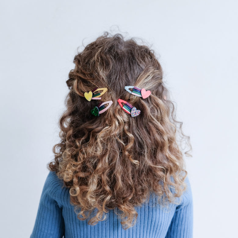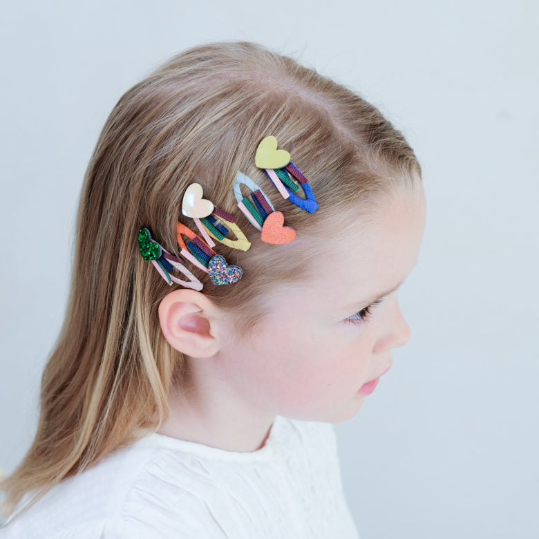 Grosgrain ribbon wrapped mini clips with contrasting leatherette hearts in a mix of finishes sat atop multicoloured grosgrain ribbon trails