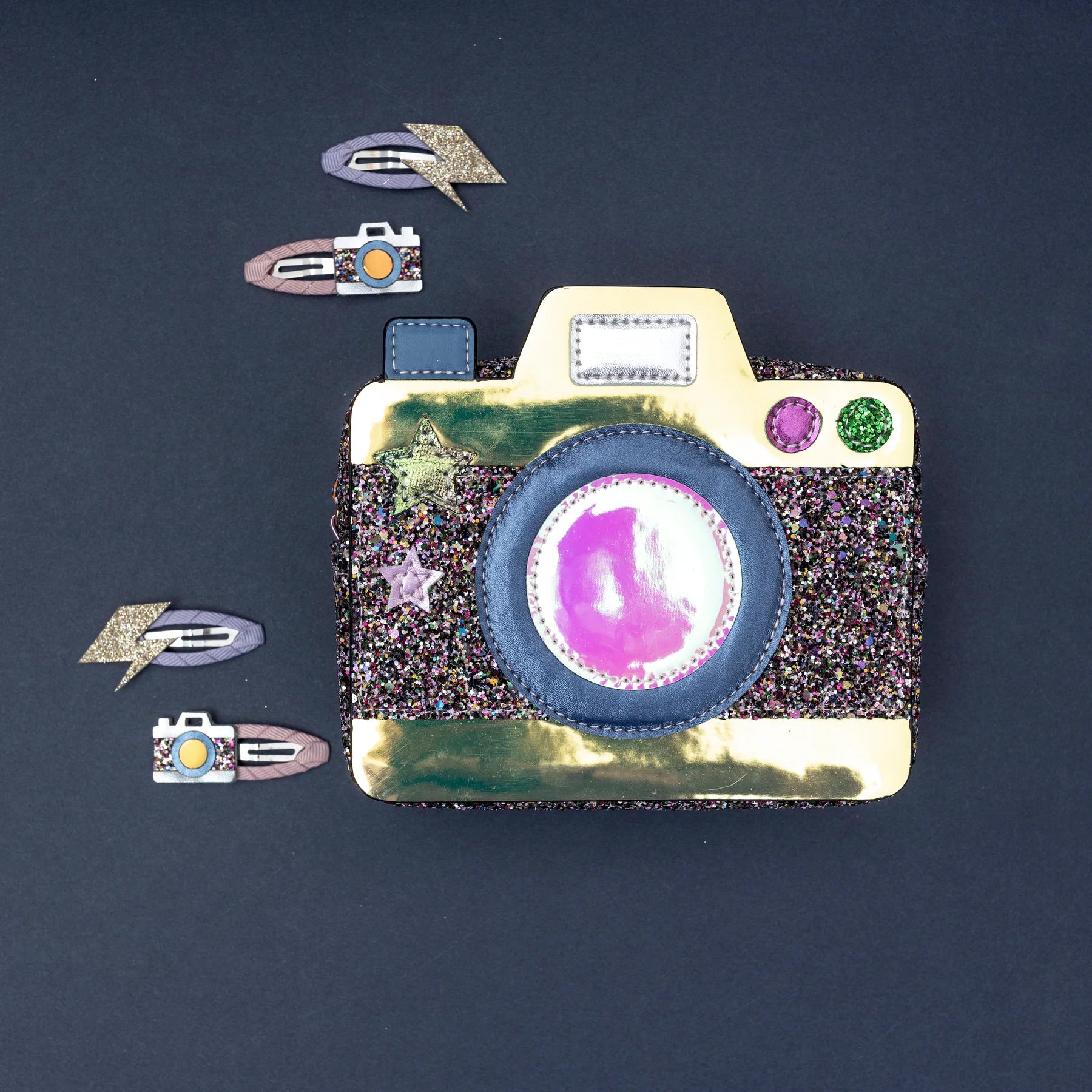 - Cameras and flashes crafted from a mix of metallic and glitter fabrics