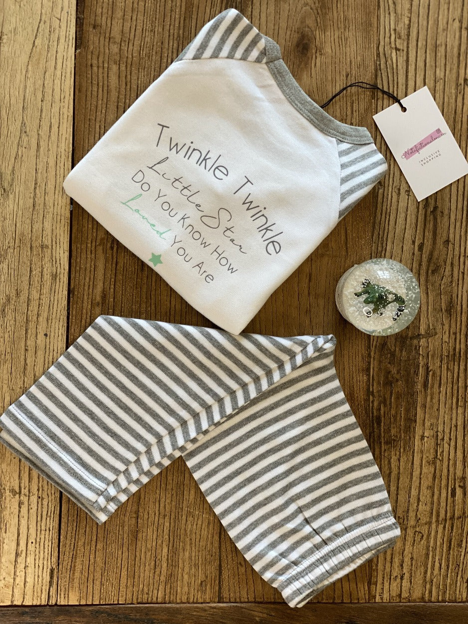 Twinkle Twinkle PJs feature a super-snuggly long-sleeved grey and white stripe design. The PJ's are handstamped in grey with 'Twinkle twinkle little star do you know how loved you are?' on the reverse with a mint green star. NFM branding on the front in grey and mint green also.