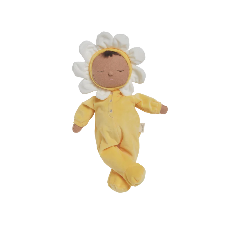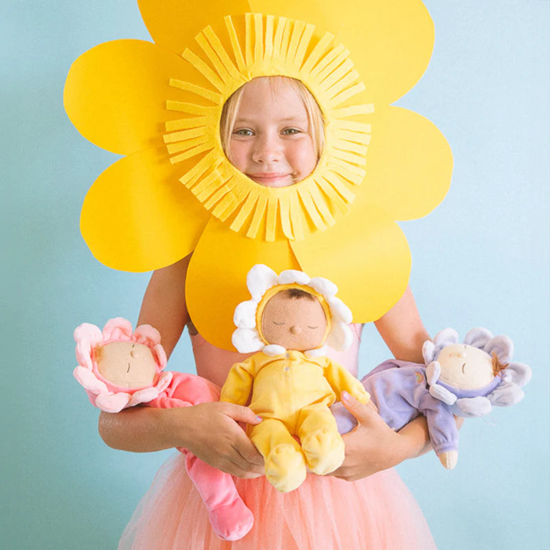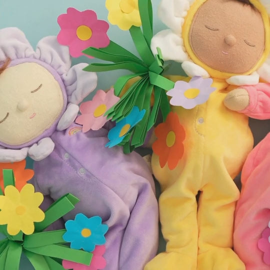 Snoozing peacefully at the bottom of the Dozy Dinkum Garden, meet baby Pip. Perfectly weighted in all the right places and snuggled in a velvety onesie, pick your Petal Dozy and tuck them into a matching Dinkum Doll petal carrier