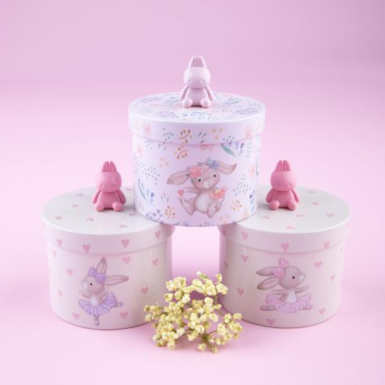 The cute tin jars from Princess Mimi with lovingly illustrated bunny designs (pink with hearts and ballet bunnies, purple with delicate flowers and flower wreath bunnies) have a super cute bunny handle (pink or rosé) on the lid, which makes opening and closing them child's play.
