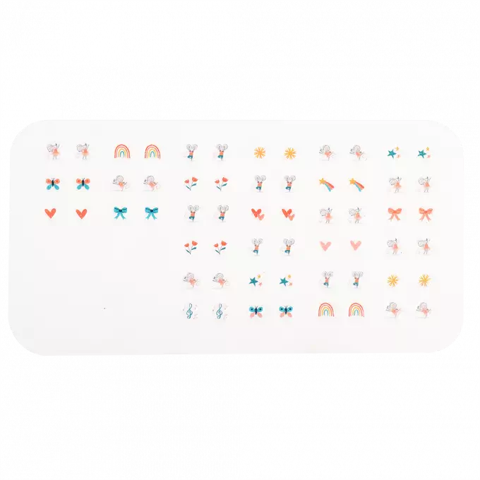 These fun stick on earrings are ideal for trendy tots who want to wear earrings, without the need for pierced ears! This set of stick on earrings features rainbows, hearts, bows and dancing mice, perfect for trying out a whole range of looks.