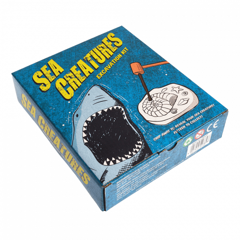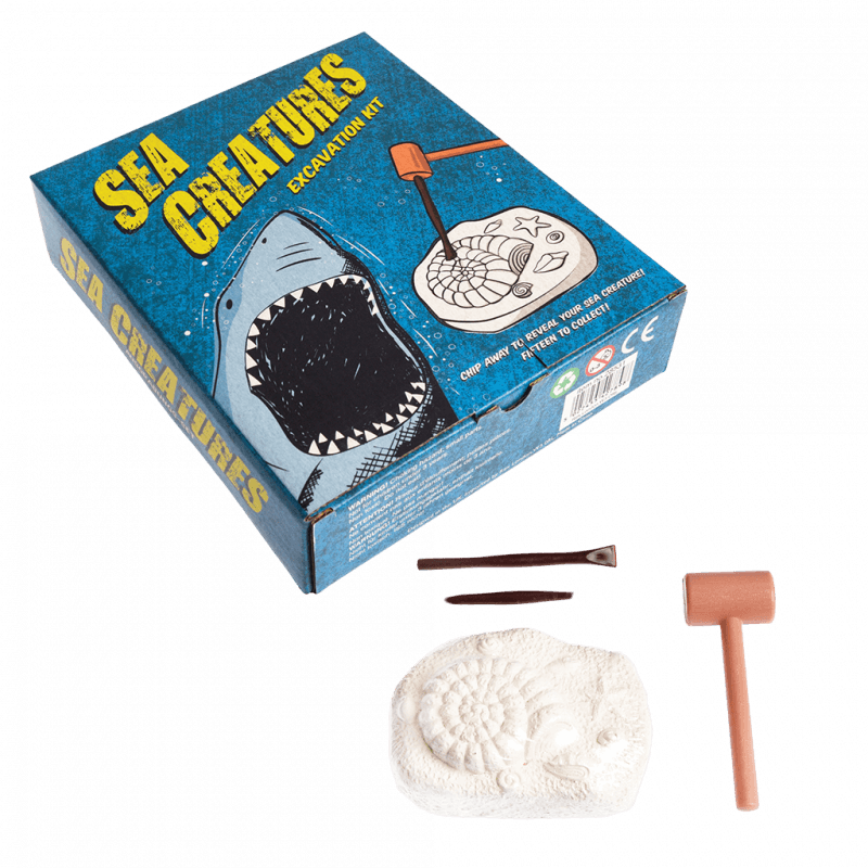 Explore the deep with this Sea Creatures excavation kit. Chip away at the fossil block with the tools provided to reveal your sea creature - there are 15 to collect!
