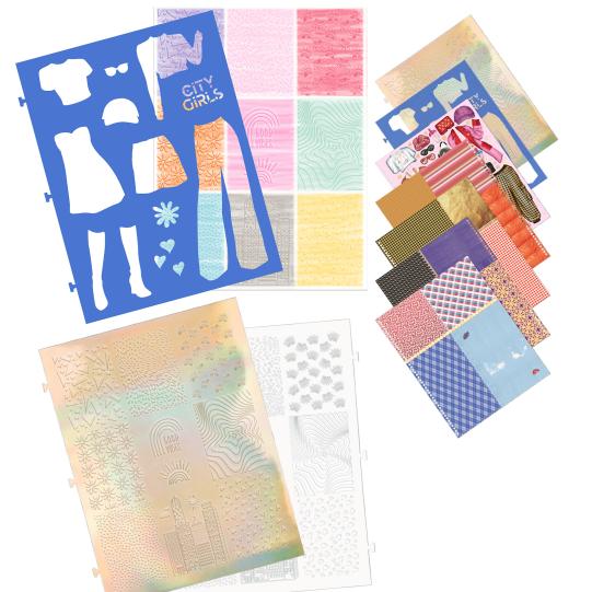 In the Special Design Book from TOPModel you can create stylish outfits for 33 model figures. The book includes 4 pages of design paper, 1 template with outlines of clothes and accessories, 1 embossing template for hatching and 1 sticker sheet. Also in the book: 4 clear painting and design instructions for cool looks.
